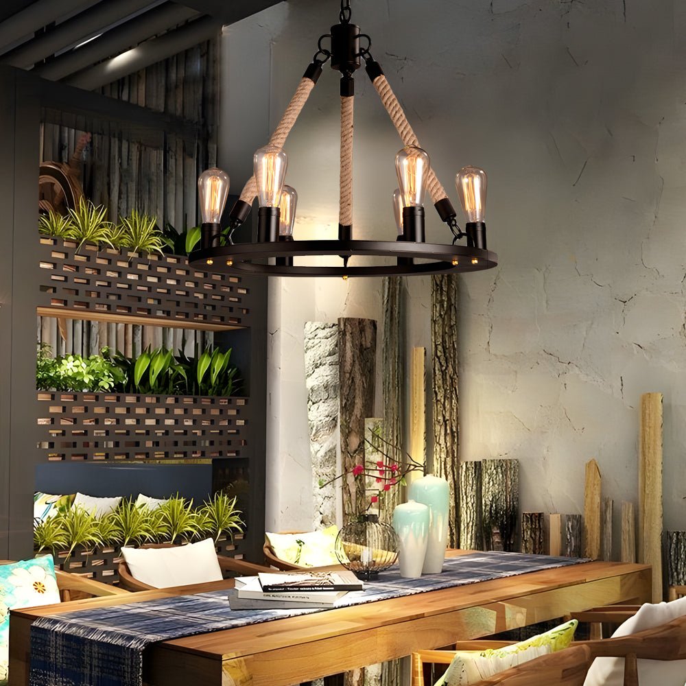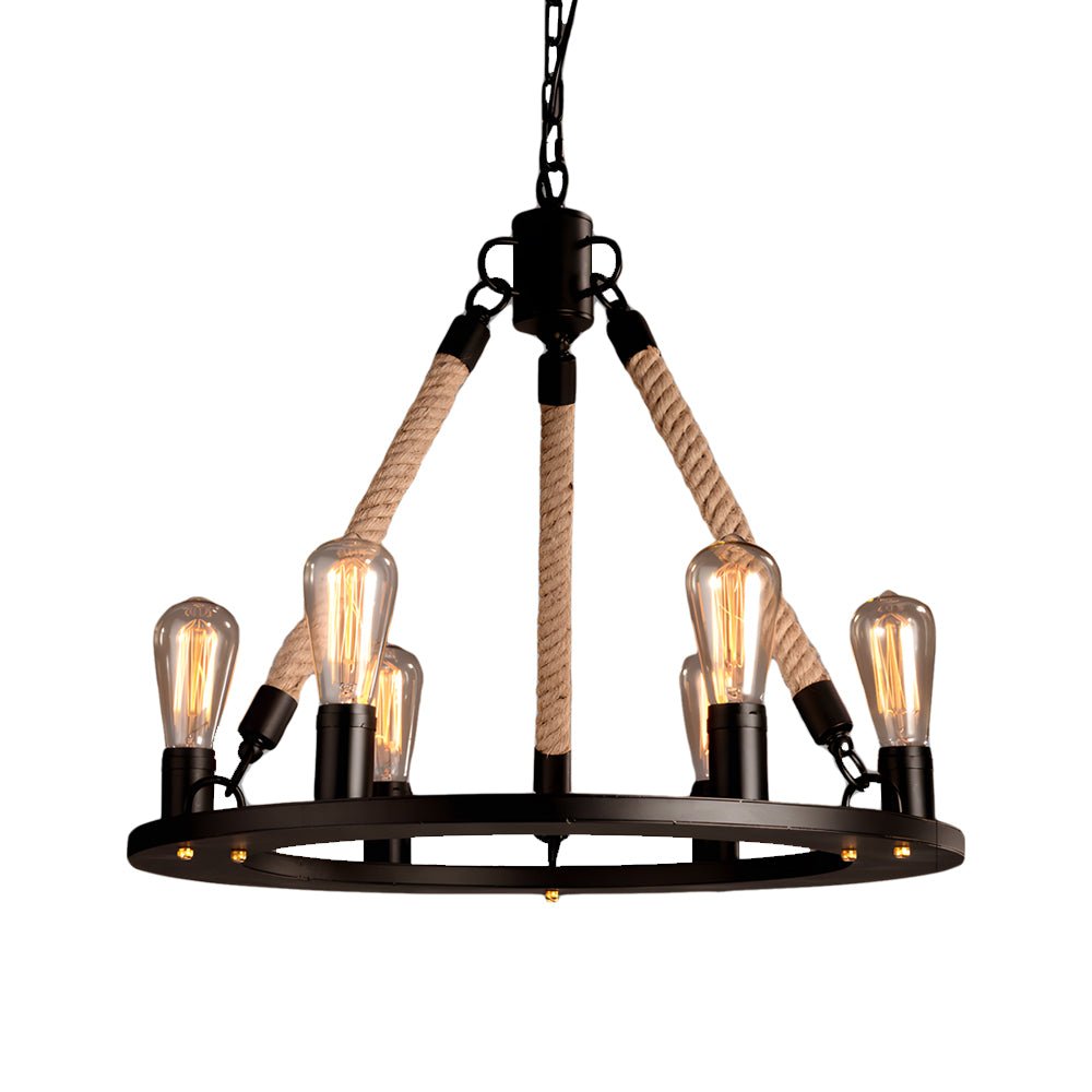 Rustic Industrial Hemp Rope Chandelier with Iron Frame